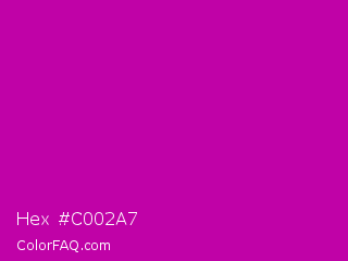 Hex #c002a7 Color is a normal magenta color and the nearest color is Heliotrope Magenta #aa00bb. Hex code #c002a7 and RGB value is rgb(192,2,167). In RGB color space, this color is composed of 75% red, 1% green, 65% blue, In CMYK color space, this color is composed of 0% cyan, 99% magenta, 13% yellow , 25% black , In HSL color space, this color has a hue angle of 308° , 98% saturation and 38% lightness.