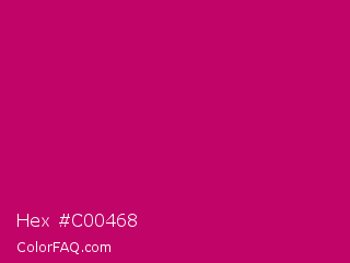 Hex #c00468 Color is a normal rose color and the nearest color is Lipstick #ab0563. Hex code #c00468 and RGB value is rgb(192,4,104). In RGB color space, this color is composed of 75% red, 2% green, 41% blue, In CMYK color space, this color is composed of 0% cyan, 98% magenta, 46% yellow , 25% black , In HSL color space, this color has a hue angle of 328° , 96% saturation and 38% lightness.