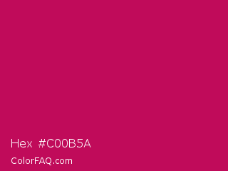 Hex #c00b5a Color is a normal rose color and the nearest color is Pictorial Carmine #c30b4e. Hex code #c00b5a and RGB value is rgb(192,11,90). In RGB color space, this color is composed of 75% red, 4% green, 35% blue, In CMYK color space, this color is composed of 0% cyan, 94% magenta, 53% yellow , 25% black , In HSL color space, this color has a hue angle of 334° , 89% saturation and 40% lightness.
