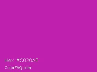 Hex #c020ae Color is a normal magenta color and the nearest color is Byzantine #bd33a4. Hex code #c020ae and RGB value is rgb(192,32,174). In RGB color space, this color is composed of 75% red, 13% green, 68% blue, In CMYK color space, this color is composed of 0% cyan, 83% magenta, 9% yellow , 25% black , In HSL color space, this color has a hue angle of 307° , 71% saturation and 44% lightness.