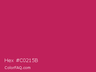 Hex #c0215b Color is a normal rose color and the nearest color is Rose Red #c21e56. Hex code #c0215b and RGB value is rgb(192,33,91). In RGB color space, this color is composed of 75% red, 13% green, 36% blue, In CMYK color space, this color is composed of 0% cyan, 83% magenta, 53% yellow , 25% black , In HSL color space, this color has a hue angle of 338° , 71% saturation and 44% lightness.