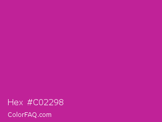 Hex #c02298 Color is a normal magenta color and the nearest color is Royal Fuchsia #ca2c92. Hex code #c02298 and RGB value is rgb(192,34,152). In RGB color space, this color is composed of 75% red, 13% green, 60% blue, In CMYK color space, this color is composed of 0% cyan, 82% magenta, 21% yellow , 25% black , In HSL color space, this color has a hue angle of 315° , 70% saturation and 44% lightness.