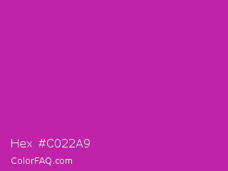 Hex #c022a9 Color is a normal magenta color and the nearest color is Byzantine #bd33a4. Hex code #c022a9 and RGB value is rgb(192,34,169). In RGB color space, this color is composed of 75% red, 13% green, 66% blue, In CMYK color space, this color is composed of 0% cyan, 82% magenta, 12% yellow , 25% black , In HSL color space, this color has a hue angle of 309° , 70% saturation and 44% lightness.