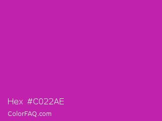 Hex #c022ae Color is a normal magenta color and the nearest color is Byzantine #bd33a4. Hex code #c022ae and RGB value is rgb(192,34,174). In RGB color space, this color is composed of 75% red, 13% green, 68% blue, In CMYK color space, this color is composed of 0% cyan, 82% magenta, 9% yellow , 25% black , In HSL color space, this color has a hue angle of 307° , 70% saturation and 44% lightness.