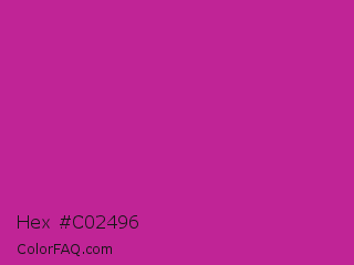 Hex #c02496 Color is a normal magenta color and the nearest color is Royal Fuchsia #ca2c92. Hex code #c02496 and RGB value is rgb(192,36,150). In RGB color space, this color is composed of 75% red, 14% green, 59% blue, In CMYK color space, this color is composed of 0% cyan, 81% magenta, 22% yellow , 25% black , In HSL color space, this color has a hue angle of 316° , 68% saturation and 45% lightness.