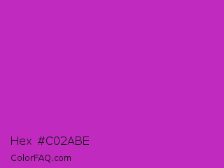 Hex #c02abe Color is a normal magenta color and the nearest color is Steel Pink #cc33cc. Hex code #c02abe and RGB value is rgb(192,42,190). In RGB color space, this color is composed of 75% red, 16% green, 75% blue, In CMYK color space, this color is composed of 0% cyan, 78% magenta, 1% yellow , 25% black , In HSL color space, this color has a hue angle of 301° , 64% saturation and 46% lightness.