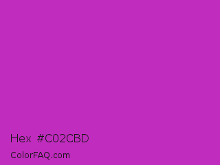 Hex #c02cbd Color is a normal magenta color and the nearest color is Steel Pink #cc33cc. Hex code #c02cbd and RGB value is rgb(192,44,189). In RGB color space, this color is composed of 75% red, 17% green, 74% blue, In CMYK color space, this color is composed of 0% cyan, 77% magenta, 2% yellow , 25% black , In HSL color space, this color has a hue angle of 301° , 63% saturation and 46% lightness.