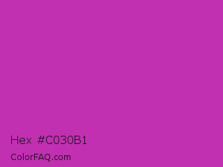 Hex #c030b1 Color is a normal magenta color and the nearest color is Byzantine #bd33a4. Hex code #c030b1 and RGB value is rgb(192,48,177). In RGB color space, this color is composed of 75% red, 19% green, 69% blue, In CMYK color space, this color is composed of 0% cyan, 75% magenta, 8% yellow , 25% black , In HSL color space, this color has a hue angle of 306° , 60% saturation and 47% lightness.