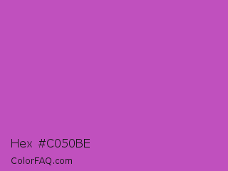 Hex #c050be Color is a normal magenta color and the nearest color is Fuchsia Pink #c154c1. Hex code #c050be and RGB value is rgb(192,80,190). In RGB color space, this color is composed of 75% red, 31% green, 75% blue, In CMYK color space, this color is composed of 0% cyan, 58% magenta, 1% yellow , 25% black , In HSL color space, this color has a hue angle of 301° , 47% saturation and 53% lightness.