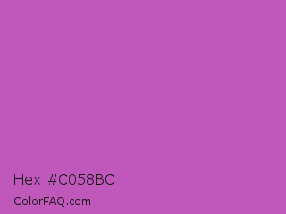 Hex #c058bc Color is a normal magenta color and the nearest color is Fuchsia Pink #c154c1. Hex code #c058bc and RGB value is rgb(192,88,188). In RGB color space, this color is composed of 75% red, 35% green, 74% blue, In CMYK color space, this color is composed of 0% cyan, 54% magenta, 2% yellow , 25% black , In HSL color space, this color has a hue angle of 302° , 45% saturation and 55% lightness.