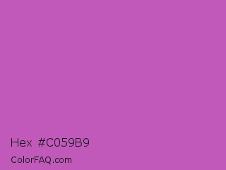Hex #c059b9 Color is a normal magenta color and the nearest color is Fuchsia Pink #c154c1. Hex code #c059b9 and RGB value is rgb(192,89,185). In RGB color space, this color is composed of 75% red, 35% green, 73% blue, In CMYK color space, this color is composed of 0% cyan, 54% magenta, 4% yellow , 25% black , In HSL color space, this color has a hue angle of 304° , 45% saturation and 55% lightness.