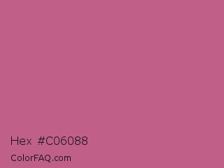 Hex #c06088 Color is a normal rose color and the nearest color is Cinnamon Satin #cd607e. Hex code #c06088 and RGB value is rgb(192,96,136). In RGB color space, this color is composed of 75% red, 38% green, 53% blue, In CMYK color space, this color is composed of 0% cyan, 50% magenta, 29% yellow , 25% black , In HSL color space, this color has a hue angle of 335° , 43% saturation and 56% lightness.