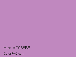 Hex #c088bf Color is a light magenta color and the nearest color is African Violet #b284be. Hex code #c088bf and RGB value is rgb(192,136,191). In RGB color space, this color is composed of 75% red, 53% green, 75% blue, In CMYK color space, this color is composed of 0% cyan, 29% magenta, 1% yellow , 25% black , In HSL color space, this color has a hue angle of 301° , 31% saturation and 64% lightness.