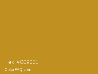Hex #c09021 Color is a normal orange color and the nearest color is Nugget #c59922. Hex code #c09021 and RGB value is rgb(192,144,33). In RGB color space, this color is composed of 75% red, 56% green, 13% blue, In CMYK color space, this color is composed of 0% cyan, 25% magenta, 83% yellow , 25% black , In HSL color space, this color has a hue angle of 42° , 71% saturation and 44% lightness.