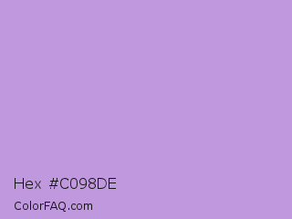 Hex #c098de Color is a light purple color and the nearest color is Bright Lavender #bf94e4. Hex code #c098de and RGB value is rgb(192,152,222). In RGB color space, this color is composed of 75% red, 60% green, 87% blue, In CMYK color space, this color is composed of 14% cyan, 32% magenta, 0% yellow , 13% black , In HSL color space, this color has a hue angle of 274° , 51% saturation and 73% lightness.