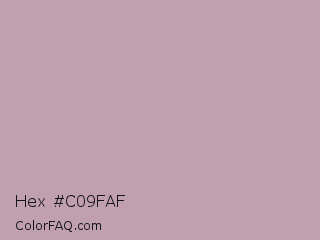 Hex #c09faf Color is a light rose color and the nearest color is Pastel Purple #b39eb5. Hex code #c09faf and RGB value is rgb(192,159,175). In RGB color space, this color is composed of 75% red, 62% green, 69% blue, In CMYK color space, this color is composed of 0% cyan, 17% magenta, 9% yellow , 25% black , In HSL color space, this color has a hue angle of 331° , 21% saturation and 69% lightness.