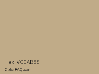 Hex #c0ab88 Color is a light orange color and the nearest color is Indian Khaki #c3b091. Hex code #c0ab88 and RGB value is rgb(192,171,136). In RGB color space, this color is composed of 75% red, 67% green, 53% blue, In CMYK color space, this color is composed of 0% cyan, 11% magenta, 29% yellow , 25% black , In HSL color space, this color has a hue angle of 38° , 31% saturation and 64% lightness.