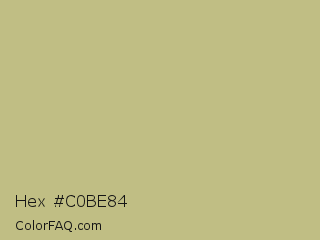 Hex #c0be84 Color is a light yellow color and the nearest color is Sage #bcb88a. Hex code #c0be84 and RGB value is rgb(192,190,132). In RGB color space, this color is composed of 75% red, 75% green, 52% blue, In CMYK color space, this color is composed of 0% cyan, 1% magenta, 31% yellow , 25% black , In HSL color space, this color has a hue angle of 58° , 32% saturation and 64% lightness.