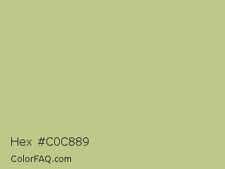 Hex #c0c889 Color is a light yellow color and the nearest color is Pine Glade #c7cd90. Hex code #c0c889 and RGB value is rgb(192,200,137). In RGB color space, this color is composed of 75% red, 78% green, 54% blue, In CMYK color space, this color is composed of 4% cyan, 0% magenta, 32% yellow , 22% black , In HSL color space, this color has a hue angle of 68° , 36% saturation and 66% lightness.