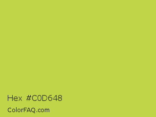 Hex #c0d648 Color is a normal yellow color and the nearest color is June Bud #bdda57. Hex code #c0d648 and RGB value is rgb(192,214,72). In RGB color space, this color is composed of 75% red, 84% green, 28% blue, In CMYK color space, this color is composed of 10% cyan, 0% magenta, 66% yellow , 16% black , In HSL color space, this color has a hue angle of 69° , 63% saturation and 56% lightness.