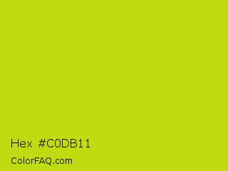 Hex #c0db11 Color is a normal yellow color and the nearest color is Fuego #bede0d. Hex code #c0db11 and RGB value is rgb(192,219,17). In RGB color space, this color is composed of 75% red, 86% green, 7% blue, In CMYK color space, this color is composed of 12% cyan, 0% magenta, 92% yellow , 14% black , In HSL color space, this color has a hue angle of 68° , 86% saturation and 46% lightness.