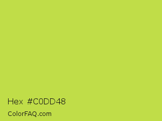 Hex #c0dd48 Color is a normal lime color and the nearest color is June Bud #bdda57. Hex code #c0dd48 and RGB value is rgb(192,221,72). In RGB color space, this color is composed of 75% red, 87% green, 28% blue, In CMYK color space, this color is composed of 13% cyan, 0% magenta, 67% yellow , 13% black , In HSL color space, this color has a hue angle of 72° , 69% saturation and 57% lightness.