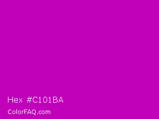 Hex #c101ba Color is a normal magenta color and the nearest color is Deep Magenta #cc00cc. Hex code #c101ba and RGB value is rgb(193,1,186). In RGB color space, this color is composed of 76% red, 0% green, 73% blue, In CMYK color space, this color is composed of 0% cyan, 99% magenta, 4% yellow , 24% black , In HSL color space, this color has a hue angle of 302° , 99% saturation and 38% lightness.