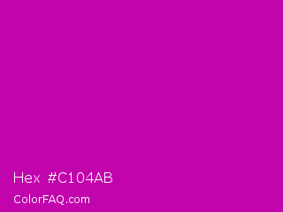 Hex #c104ab Color is a normal magenta color and the nearest color is Heliotrope Magenta #aa00bb. Hex code #c104ab and RGB value is rgb(193,4,171). In RGB color space, this color is composed of 76% red, 2% green, 67% blue, In CMYK color space, this color is composed of 0% cyan, 98% magenta, 11% yellow , 24% black , In HSL color space, this color has a hue angle of 307° , 96% saturation and 39% lightness.