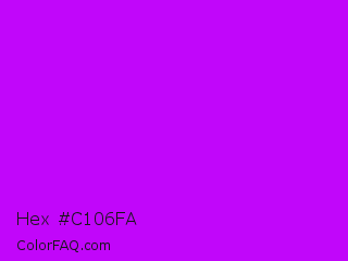 Hex #c106fa Color is a normal purple color and the nearest color is Electric Purple #bf00ff. Hex code #c106fa and RGB value is rgb(193,6,250). In RGB color space, this color is composed of 76% red, 2% green, 98% blue, In CMYK color space, this color is composed of 23% cyan, 98% magenta, 0% yellow , 2% black , In HSL color space, this color has a hue angle of 286° , 96% saturation and 50% lightness.