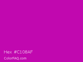 Hex #c108af Color is a normal magenta color and the nearest color is Heliotrope Magenta #aa00bb. Hex code #c108af and RGB value is rgb(193,8,175). In RGB color space, this color is composed of 76% red, 3% green, 69% blue, In CMYK color space, this color is composed of 0% cyan, 96% magenta, 9% yellow , 24% black , In HSL color space, this color has a hue angle of 306° , 92% saturation and 39% lightness.