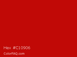 Hex #c10906 Color is a normal red color and the nearest color is Guardsman Red #ba0101. Hex code #c10906 and RGB value is rgb(193,9,6). In RGB color space, this color is composed of 76% red, 4% green, 2% blue, In CMYK color space, this color is composed of 0% cyan, 95% magenta, 97% yellow , 24% black , In HSL color space, this color has a hue angle of 1° , 94% saturation and 39% lightness.