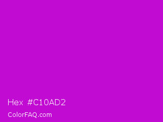 Hex #c10ad2 Color is a normal magenta color and the nearest color is Deep Magenta #cc00cc. Hex code #c10ad2 and RGB value is rgb(193,10,210). In RGB color space, this color is composed of 76% red, 4% green, 82% blue, In CMYK color space, this color is composed of 8% cyan, 95% magenta, 0% yellow , 18% black , In HSL color space, this color has a hue angle of 295° , 91% saturation and 43% lightness.