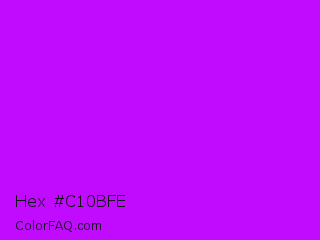 Hex #c10bfe Color is a normal purple color and the nearest color is Electric Purple #bf00ff. Hex code #c10bfe and RGB value is rgb(193,11,254). In RGB color space, this color is composed of 76% red, 4% green, 100% blue, In CMYK color space, this color is composed of 24% cyan, 96% magenta, 0% yellow , 0% black , In HSL color space, this color has a hue angle of 285° , 99% saturation and 52% lightness.
