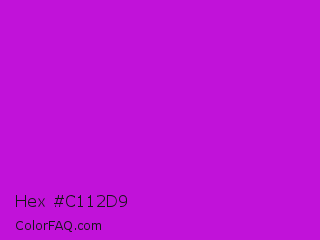Hex #c112d9 Color is a normal magenta color and the nearest color is Vivid Mulberry #b80ce3. Hex code #c112d9 and RGB value is rgb(193,18,217). In RGB color space, this color is composed of 76% red, 7% green, 85% blue, In CMYK color space, this color is composed of 11% cyan, 92% magenta, 0% yellow , 15% black , In HSL color space, this color has a hue angle of 293° , 85% saturation and 46% lightness.