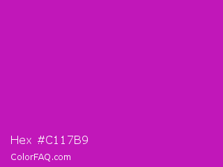 Hex #c117b9 Color is a normal magenta color and the nearest color is Deep Magenta #cc00cc. Hex code #c117b9 and RGB value is rgb(193,23,185). In RGB color space, this color is composed of 76% red, 9% green, 73% blue, In CMYK color space, this color is composed of 0% cyan, 88% magenta, 4% yellow , 24% black , In HSL color space, this color has a hue angle of 303° , 79% saturation and 42% lightness.