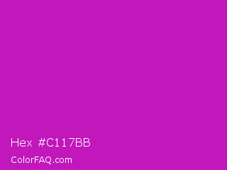 Hex #c117bb Color is a normal magenta color and the nearest color is Deep Magenta #cc00cc. Hex code #c117bb and RGB value is rgb(193,23,187). In RGB color space, this color is composed of 76% red, 9% green, 73% blue, In CMYK color space, this color is composed of 0% cyan, 88% magenta, 3% yellow , 24% black , In HSL color space, this color has a hue angle of 302° , 79% saturation and 42% lightness.