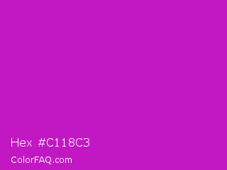 Hex #c118c3 Color is a normal magenta color and the nearest color is Deep Magenta #cc00cc. Hex code #c118c3 and RGB value is rgb(193,24,195). In RGB color space, this color is composed of 76% red, 9% green, 76% blue, In CMYK color space, this color is composed of 1% cyan, 88% magenta, 0% yellow , 24% black , In HSL color space, this color has a hue angle of 299° , 78% saturation and 43% lightness.