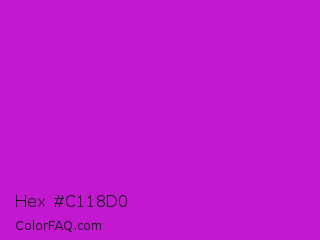 Hex #c118d0 Color is a normal magenta color and the nearest color is Vivid Mulberry #b80ce3. Hex code #c118d0 and RGB value is rgb(193,24,208). In RGB color space, this color is composed of 76% red, 9% green, 82% blue, In CMYK color space, this color is composed of 7% cyan, 88% magenta, 0% yellow , 18% black , In HSL color space, this color has a hue angle of 295° , 79% saturation and 45% lightness.