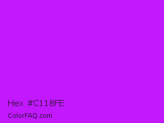 Hex #c118fe Color is a normal purple color and the nearest color is Electric Purple #bf00ff. Hex code #c118fe and RGB value is rgb(193,24,254). In RGB color space, this color is composed of 76% red, 9% green, 100% blue, In CMYK color space, this color is composed of 24% cyan, 91% magenta, 0% yellow , 0% black , In HSL color space, this color has a hue angle of 284° , 99% saturation and 55% lightness.