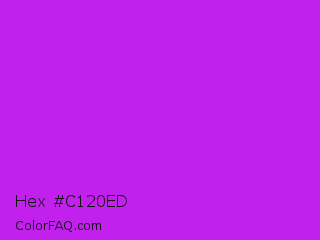 Hex #c120ed Color is a normal purple color and the nearest color is Vivid Mulberry #b80ce3. Hex code #c120ed and RGB value is rgb(193,32,237). In RGB color space, this color is composed of 76% red, 13% green, 93% blue, In CMYK color space, this color is composed of 19% cyan, 86% magenta, 0% yellow , 7% black , In HSL color space, this color has a hue angle of 287° , 85% saturation and 53% lightness.