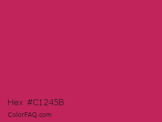 Hex #c1245b Color is a normal rose color and the nearest color is Rose Red #c21e56. Hex code #c1245b and RGB value is rgb(193,36,91). In RGB color space, this color is composed of 76% red, 14% green, 36% blue, In CMYK color space, this color is composed of 0% cyan, 81% magenta, 53% yellow , 24% black , In HSL color space, this color has a hue angle of 339° , 69% saturation and 45% lightness.