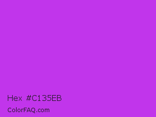 Hex #c135eb Color is a normal purple color and the nearest color is Steel Pink #cc33cc. Hex code #c135eb and RGB value is rgb(193,53,235). In RGB color space, this color is composed of 76% red, 21% green, 92% blue, In CMYK color space, this color is composed of 18% cyan, 77% magenta, 0% yellow , 8% black , In HSL color space, this color has a hue angle of 286° , 82% saturation and 56% lightness.