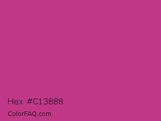Hex #c13888 Color is a normal magenta color and the nearest color is Medium Red Violet #bb3385. Hex code #c13888 and RGB value is rgb(193,56,136). In RGB color space, this color is composed of 76% red, 22% green, 53% blue, In CMYK color space, this color is composed of 0% cyan, 71% magenta, 30% yellow , 24% black , In HSL color space, this color has a hue angle of 325° , 55% saturation and 49% lightness.