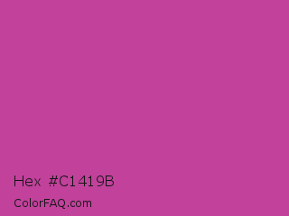 Hex #c1419b Color is a normal magenta color and the nearest color is Byzantine #bd33a4. Hex code #c1419b and RGB value is rgb(193,65,155). In RGB color space, this color is composed of 76% red, 25% green, 61% blue, In CMYK color space, this color is composed of 0% cyan, 66% magenta, 20% yellow , 24% black , In HSL color space, this color has a hue angle of 318° , 51% saturation and 51% lightness.