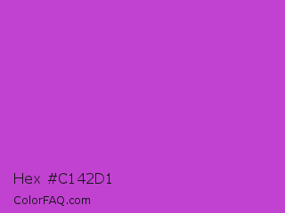 Hex #c142d1 Color is a normal magenta color and the nearest color is Steel Pink #cc33cc. Hex code #c142d1 and RGB value is rgb(193,66,209). In RGB color space, this color is composed of 76% red, 26% green, 82% blue, In CMYK color space, this color is composed of 8% cyan, 68% magenta, 0% yellow , 18% black , In HSL color space, this color has a hue angle of 293° , 61% saturation and 54% lightness.