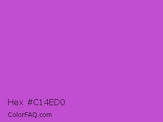 Hex #c14ed0 Color is a normal magenta color and the nearest color is Medium Orchid #ba55d3. Hex code #c14ed0 and RGB value is rgb(193,78,208). In RGB color space, this color is composed of 76% red, 31% green, 82% blue, In CMYK color space, this color is composed of 7% cyan, 63% magenta, 0% yellow , 18% black , In HSL color space, this color has a hue angle of 293° , 58% saturation and 56% lightness.