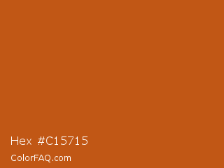 Hex #c15715 Color is a normal orange color and the nearest color is Orange Roughy #c45719. Hex code #c15715 and RGB value is rgb(193,87,21). In RGB color space, this color is composed of 76% red, 34% green, 8% blue, In CMYK color space, this color is composed of 0% cyan, 55% magenta, 89% yellow , 24% black , In HSL color space, this color has a hue angle of 23° , 80% saturation and 42% lightness.