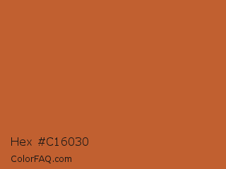 Hex #c16030 Color is a normal orange color and the nearest color is Tuscany #bd5e2e. Hex code #c16030 and RGB value is rgb(193,96,48). In RGB color space, this color is composed of 76% red, 38% green, 19% blue, In CMYK color space, this color is composed of 0% cyan, 50% magenta, 75% yellow , 24% black , In HSL color space, this color has a hue angle of 20° , 60% saturation and 47% lightness.
