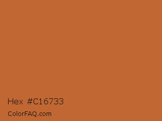 Hex #c16733 Color is a normal orange color and the nearest color is Tuscany #bd5e2e. Hex code #c16733 and RGB value is rgb(193,103,51). In RGB color space, this color is composed of 76% red, 40% green, 20% blue, In CMYK color space, this color is composed of 0% cyan, 47% magenta, 74% yellow , 24% black , In HSL color space, this color has a hue angle of 22° , 58% saturation and 48% lightness.