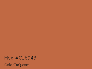 Hex #c16943 Color is a normal orange color and the nearest color is Copper Red #cb6d51. Hex code #c16943 and RGB value is rgb(193,105,67). In RGB color space, this color is composed of 76% red, 41% green, 26% blue, In CMYK color space, this color is composed of 0% cyan, 46% magenta, 65% yellow , 24% black , In HSL color space, this color has a hue angle of 18° , 50% saturation and 51% lightness.